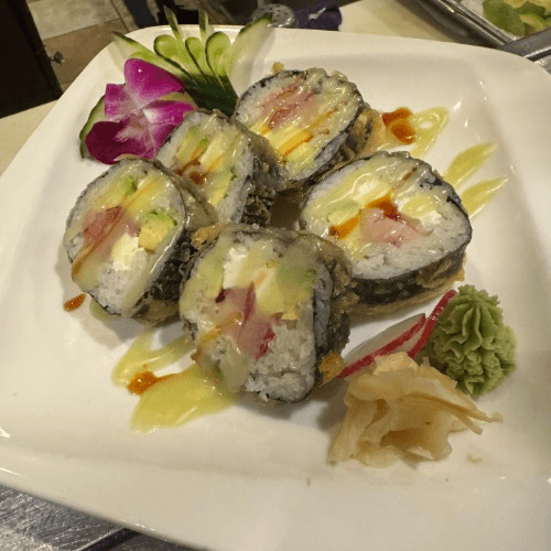 Deep-fried spicy tuna, yellowtail, salmon, cream cheese & avocado