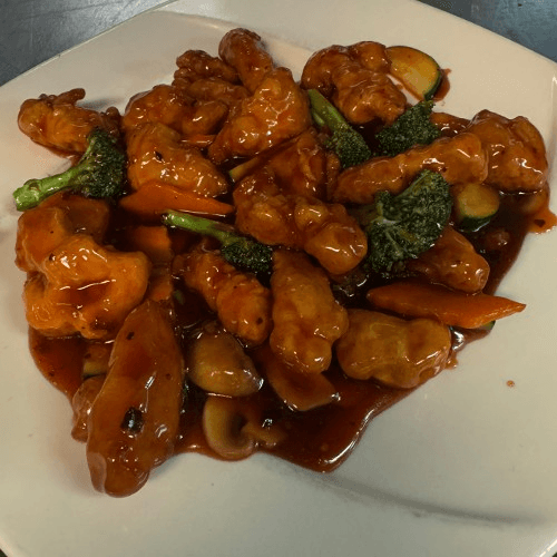 Breaded chicken or shrimp with assorted vegeta- bles in sweet hot sauce