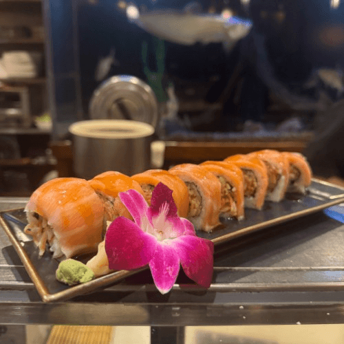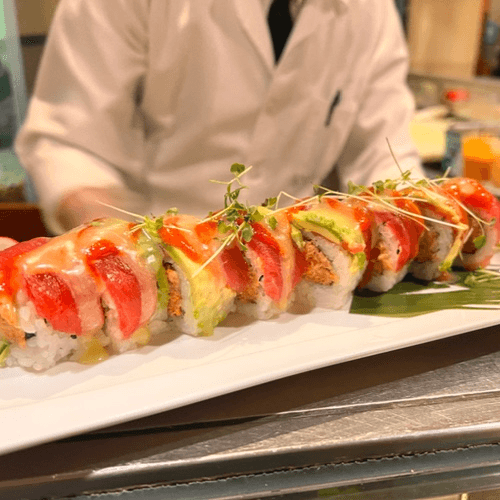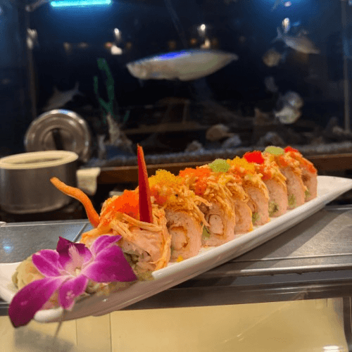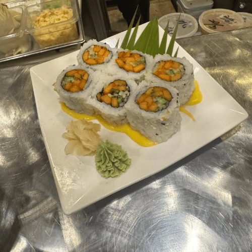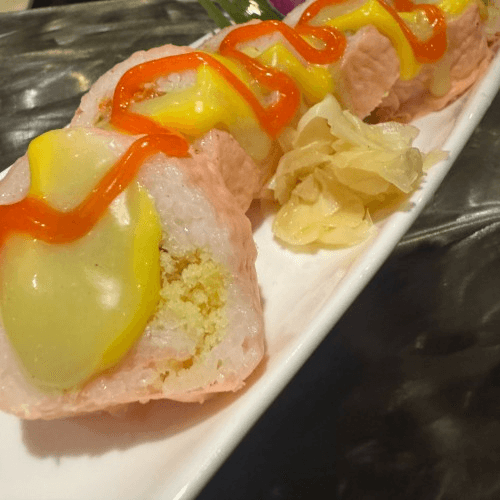 A spicy salmon roll with avocado, mango and topped with tuna, yellowtail, mango, mango sauce, crunch flakes and black tobiko
