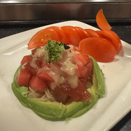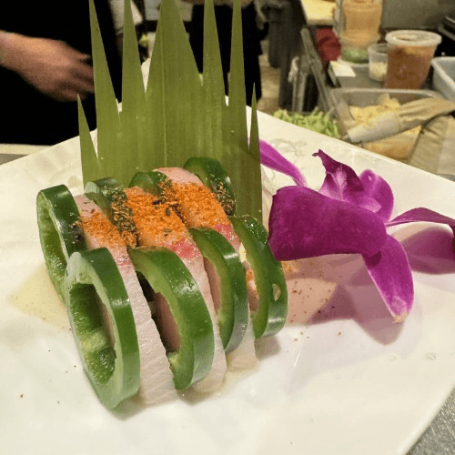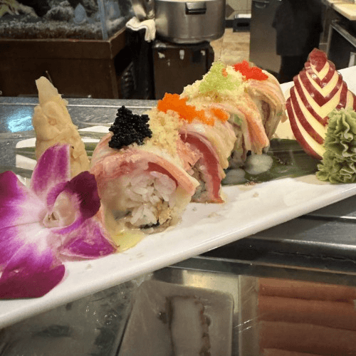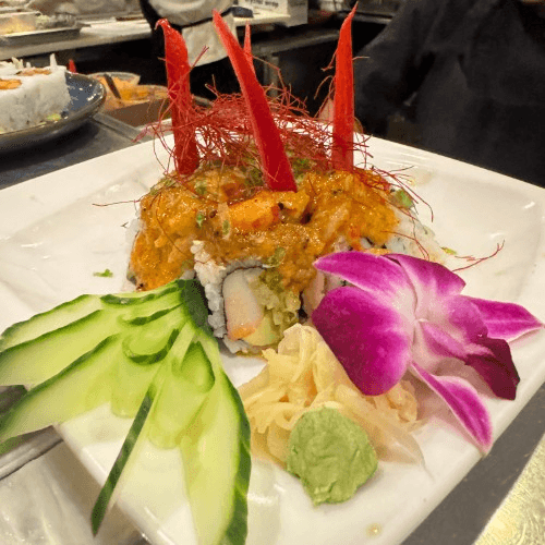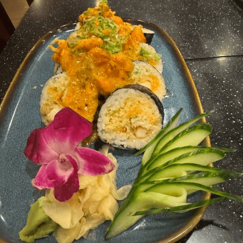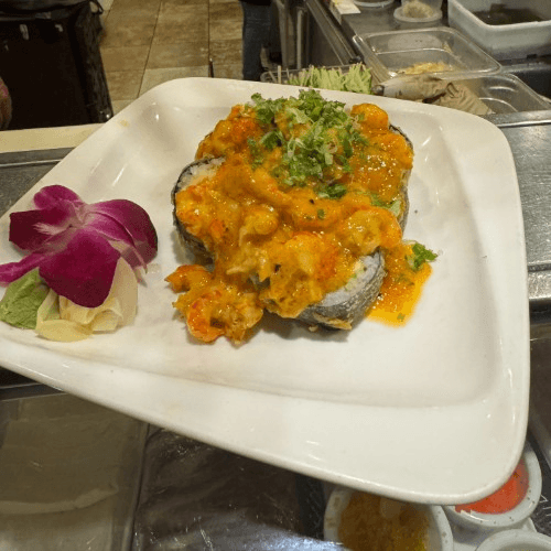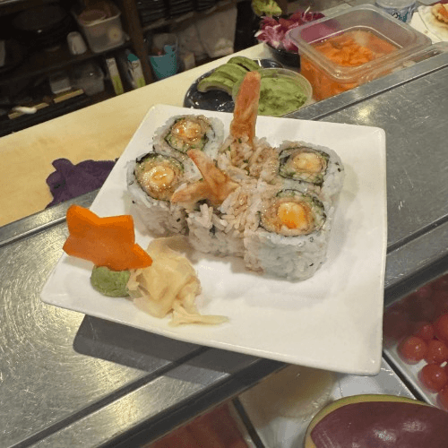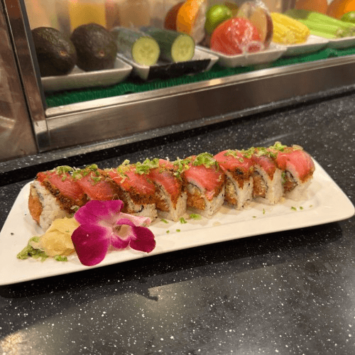 Spicy shrimp roll topped with tuna, inari (tofu skin), avocado, crab, tempura flakes, wasabi sauce & eel sauce