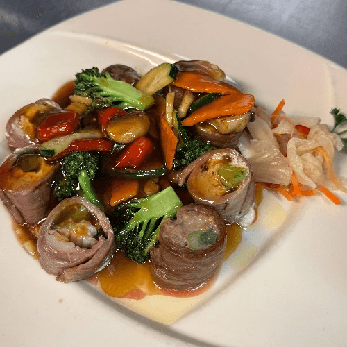 Steak rolls stuffed with cream cheese, scallions, crab meat served with mixed veggie and house special brown sauce
