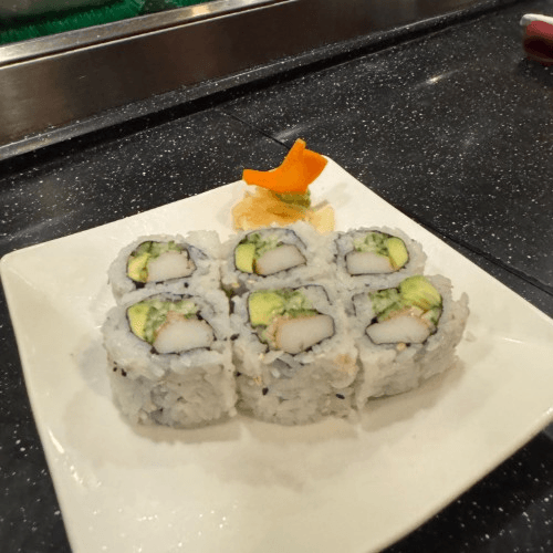 A variety of fresh fish wrapped on top of crab meat, avocado and cucumber