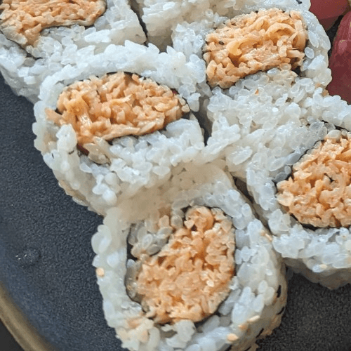 10 pieces. Spicy king crab, shrimp tempura and cucumber wrapped in seaweed