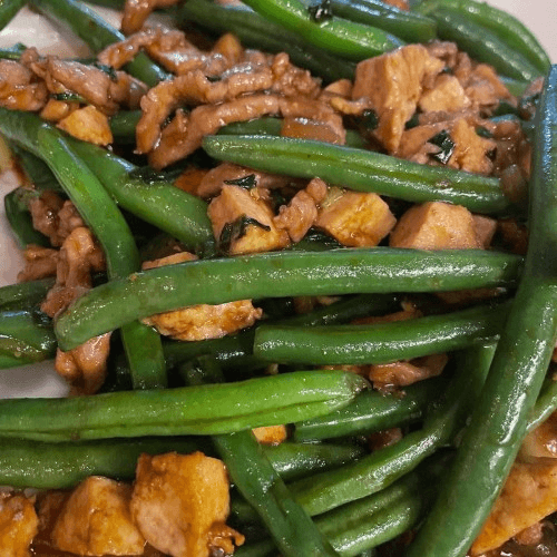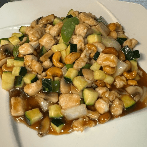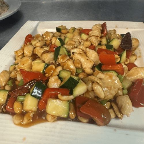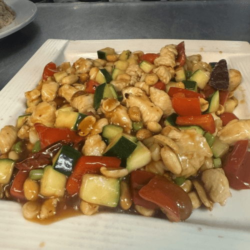 Chicken, shrimp or beef your choice of meat cooked with peanuts, green onions, and diced zucchini in a hot spicy sauce