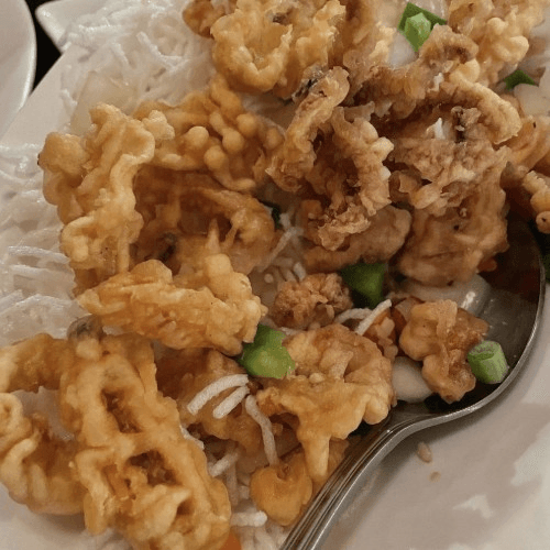 Battered and fried in a sweet and sour sauce served with carrots, green peppers and pineapples