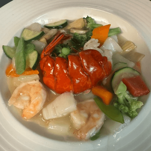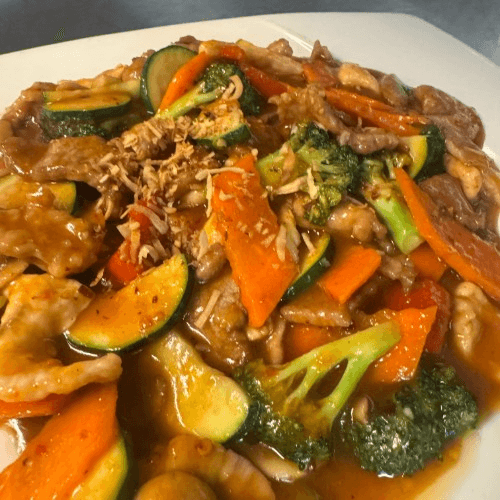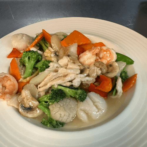 Scallops, shrimp, chicken, pork, beef & vegetables stir-fried in a flavorful brown sauce