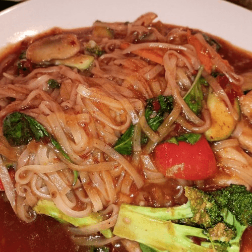 Dried tofu, eggs, and traditional rice noodles, stir-fried in a traditional thai fish sauce, garnished with crunched peanuts