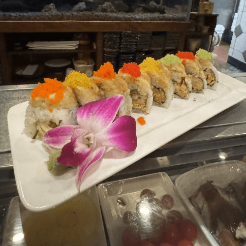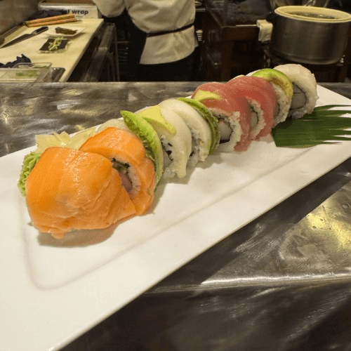10 pieces. Spicy tuna, salmon and yellowtail rolled with avocado and tempura crunch in soy bean seaweed and glazed with a colorful variety of delicious sauces