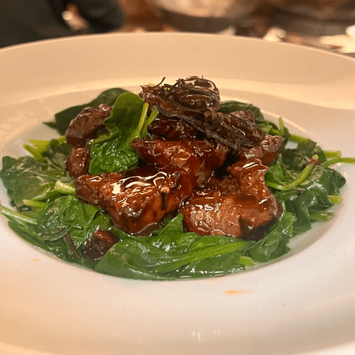 Tender chunks of fillet mignon sauteed in a rice scal- lion brown sauce, served over a fresh bed of spinach