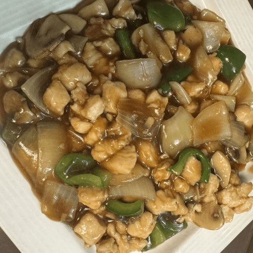 Diced white meat chicken meat, green peppers, onions, and mushrooms in a garlic sauce