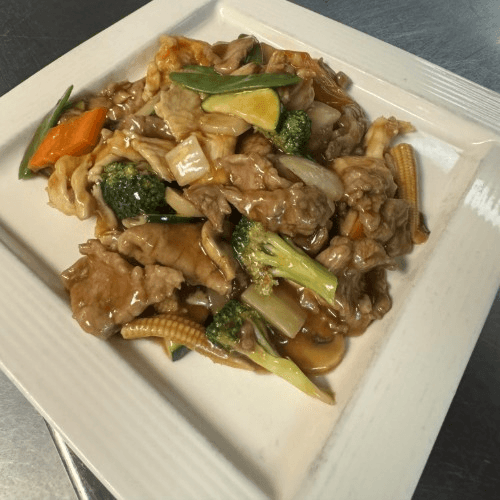 Chicken, beef, or shrimp, with mushrooms, diced zucchini, snow pea pods and chinese cabbage in a brown sauce