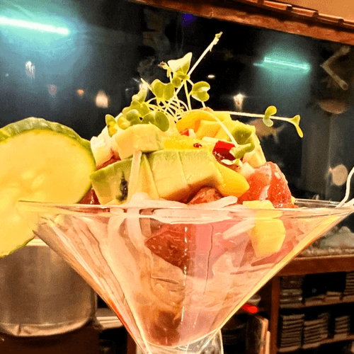 Tuna with teriyaki and sriracha sauce with avocado, strawberry, orange and japanese style sauce on a bed of shredded radish