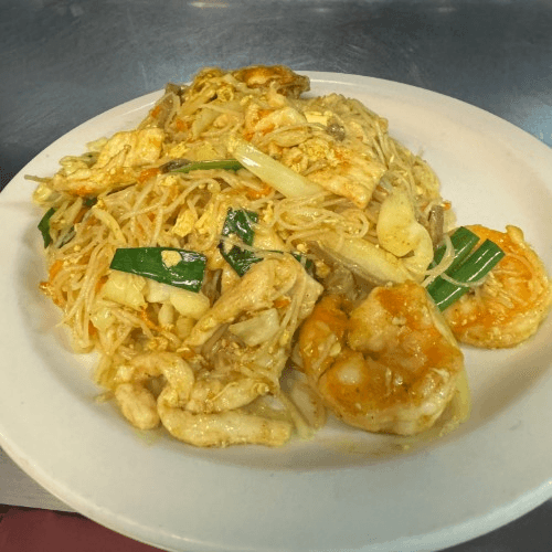 Rice noodles stir fried with chicken, pork, shrimp, carrots, cabbage, eggs, and onions in a yellow curry sauce
