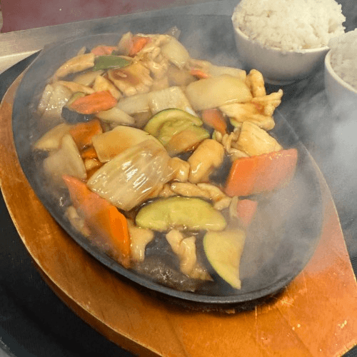 Sauteed chicken with vegetables brushed with teriyaki sauce served on a sizzling hot plate