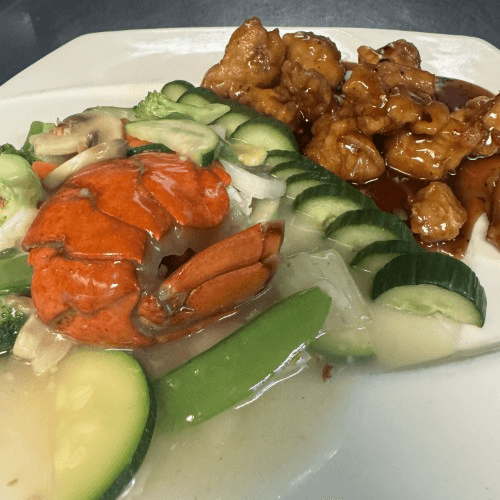 Romantic duo of lobster sauteed in a light sauce and deep-fried dark meat chicken in a tangy sweet hot sauce