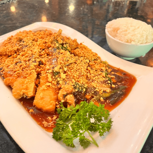 Deep-fried seasonal fish fillet topped with a tam- arind sauce, fresh garlic, seasonal vegetables, hot peppers, and basil leaves