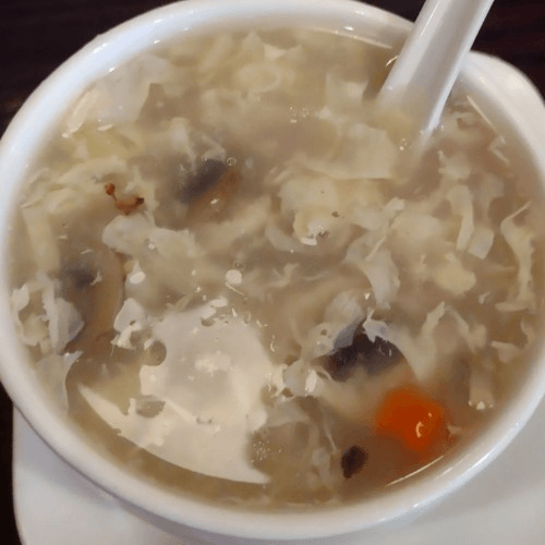 Delectable hot and sour soup. Loaded with big bites of shrimp, mussels, scallops, mush- rooms, and tofu