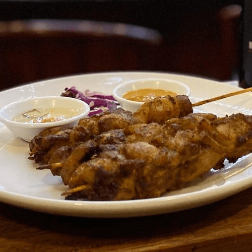 3 pieces. Three skewers of tender marinated chicken chunks served with a peanut dipping sauce and a sweet onion and cucumber vinaigrette