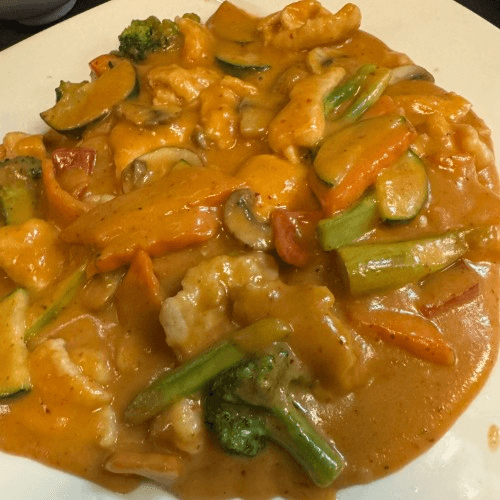 Stir-fried with asparagus, onions, bell peppers, and mushrooms in a special hot and sweet curry sauce