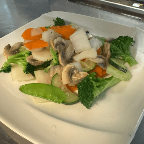 White chicken meat served with assorted seasonal vegetables in a light garlic sauce