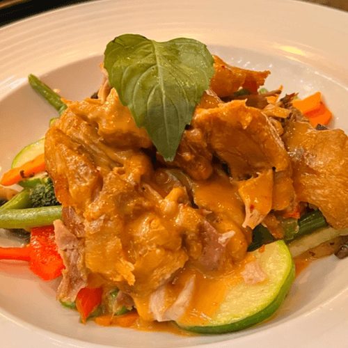 Lightly deep fried boneless duck served in a special blend of fruit juice, lemon grass, kaffir lime leaves, Thai herbs and a splash of coconut milk