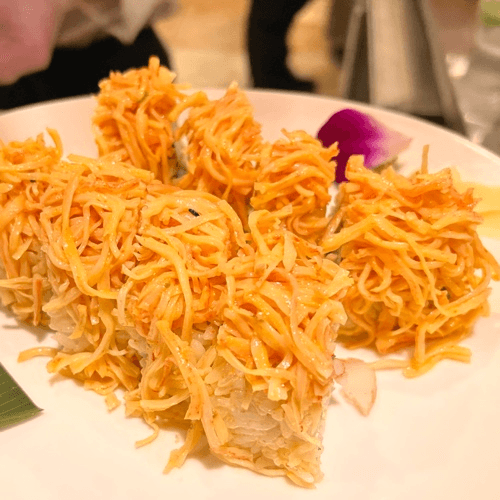 A spicy shrimp and sweet potato roll topped with seared cream cheese, shredded black tobiko, green onions and wasabi mayonnaise